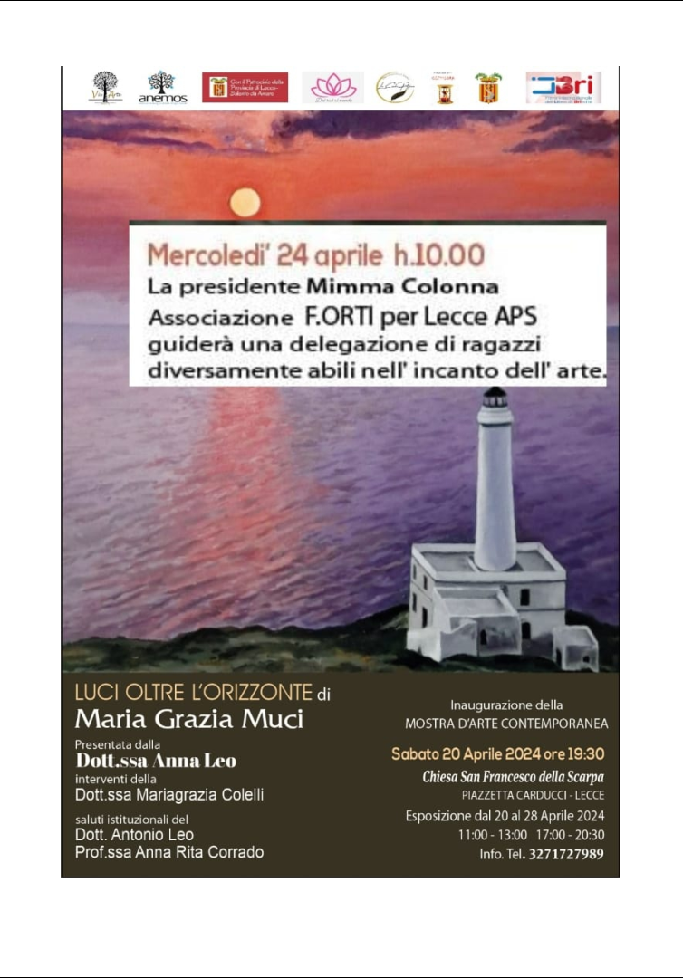 VISITA GUIDATA DEL 24 APRILE 2024Il 24 aprile 2024 l'Associazione F.ORTI per Lecce ha accompagnato gli ospiti delle comunità riabilitative alla mostra di arte contemporanea "Luci oltre l'orizzonte", dell'artista Maria Grazia Muci.