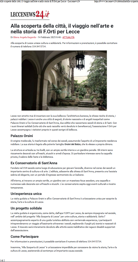 VISITA GUIDATA DEL 16 FEBBRAIO 2025Splendida visita guidata nel Centro storico di Lecce, da Porta Rudiae al Palazzo Apostolico Orsini, Chiesa di S. Teresa, Ex-Conservatorio di S. Anna e Chiesa di S. Anna con la nostra guida Adele Sposato. Ringraziamo tutti coloro che ci hanno consentito di entrare in luoghi solitamente chiusi al pubblico, dalla proprietaria del Palazzo Apostolico Orsini, al Sindaco di Lecce al Rettore della Chiesa di S. Anna. In via eccezionale ci è stato consentito l'accesso alle cellette del collegio femminile dove erano ospitate donne di famiglie nobiliari leccesi, nubili, vedove o 'malmaritate'.